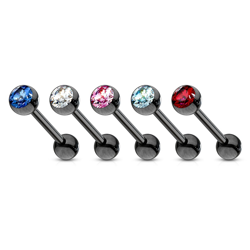 Zwarte tongpiercing met verschillende gekleurde stenen