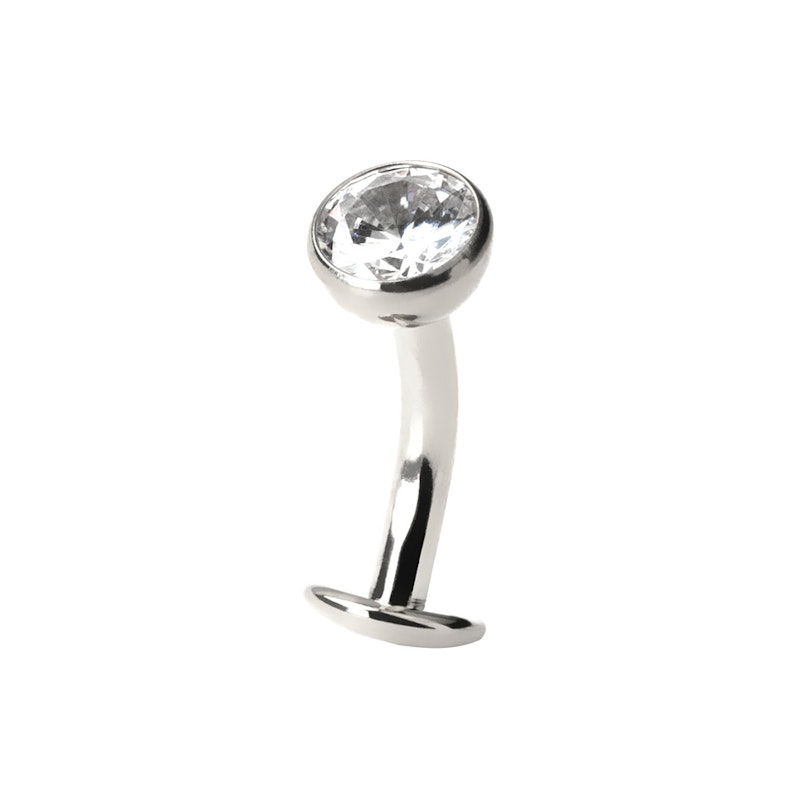 Deze zwevende of omgedraaide navel piercing heeft een gezette CZ steen in het bovenste balletje, wat boven je navel zal zitten. Het andere uiteinde van de barbell heeft een disc die discreet onder je navel zit, waardoor het lijkt alsof het sieraad zweeft.